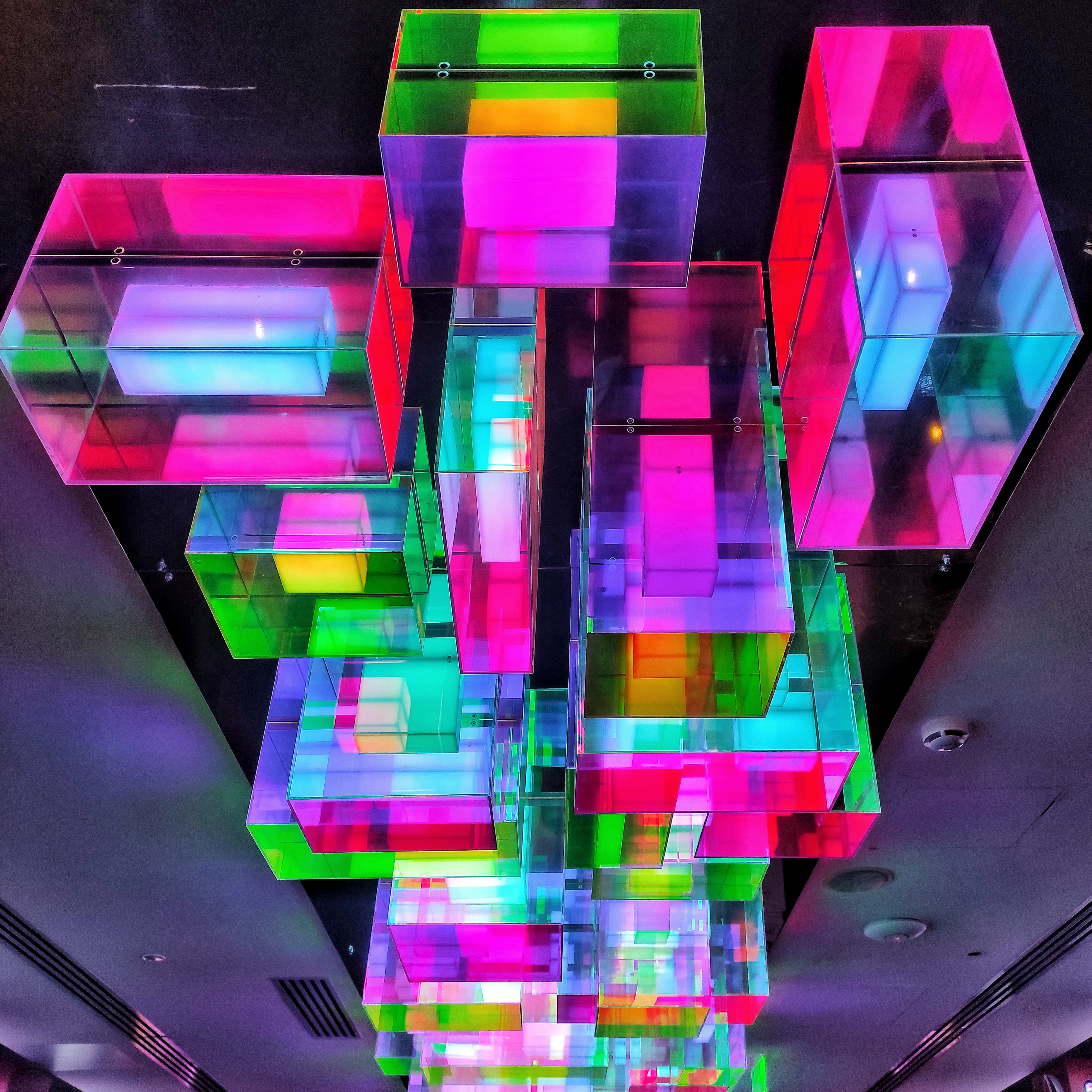 Light installation «Personal Supernova» made of semitranslucent colored acrylic. Complex reflections occur while this object is exposed by light.