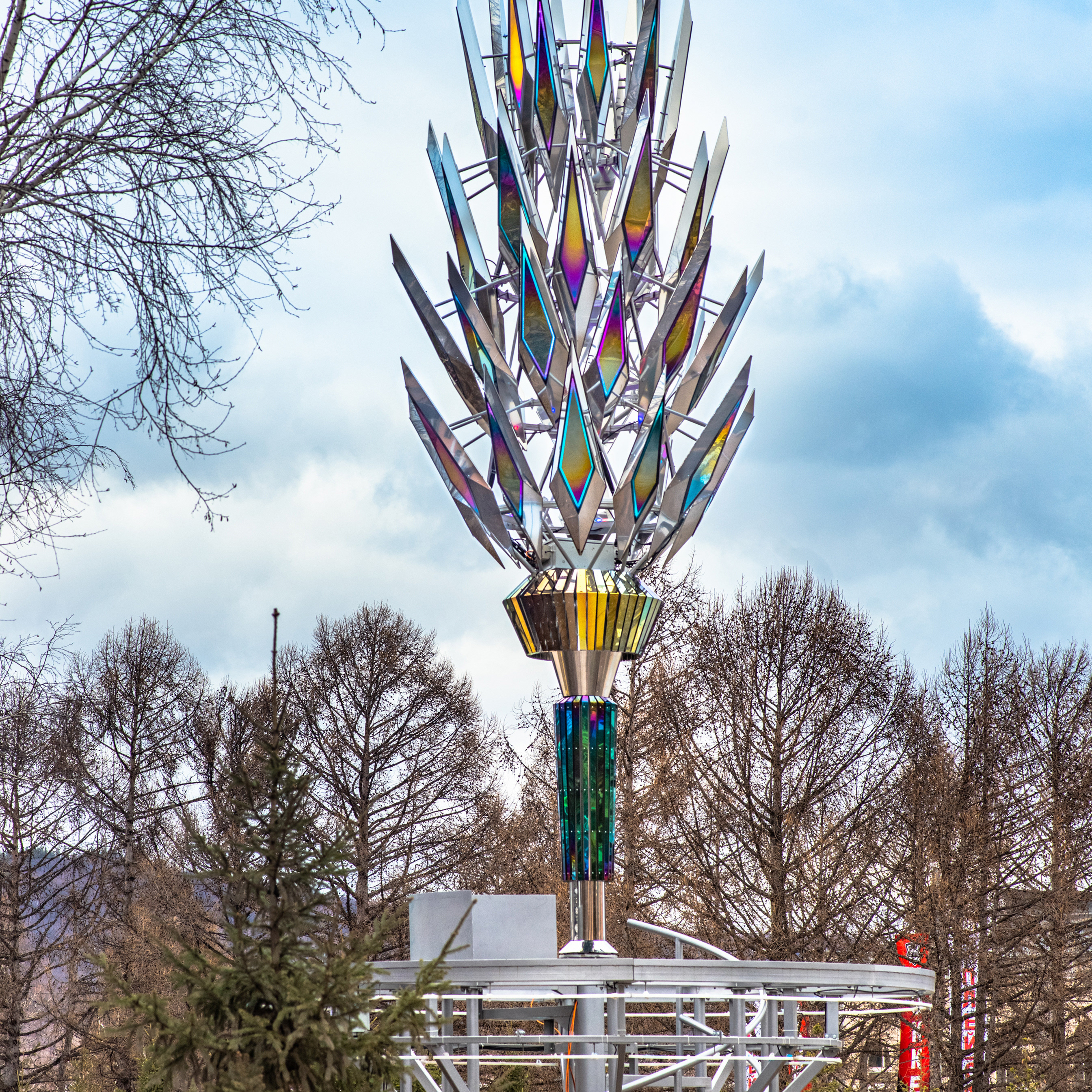 Variations of movement, performed by elements at the top and botom of the sculpture form a balanced composition - regardless the spectator's viewpoint. The reflections from the object on the pond’s surface become another expressive feature. This minor architectural form is a reference to futuristic buildings and utopian projects of the Russian “cosmists” - where light and dynamics are the main structural components.