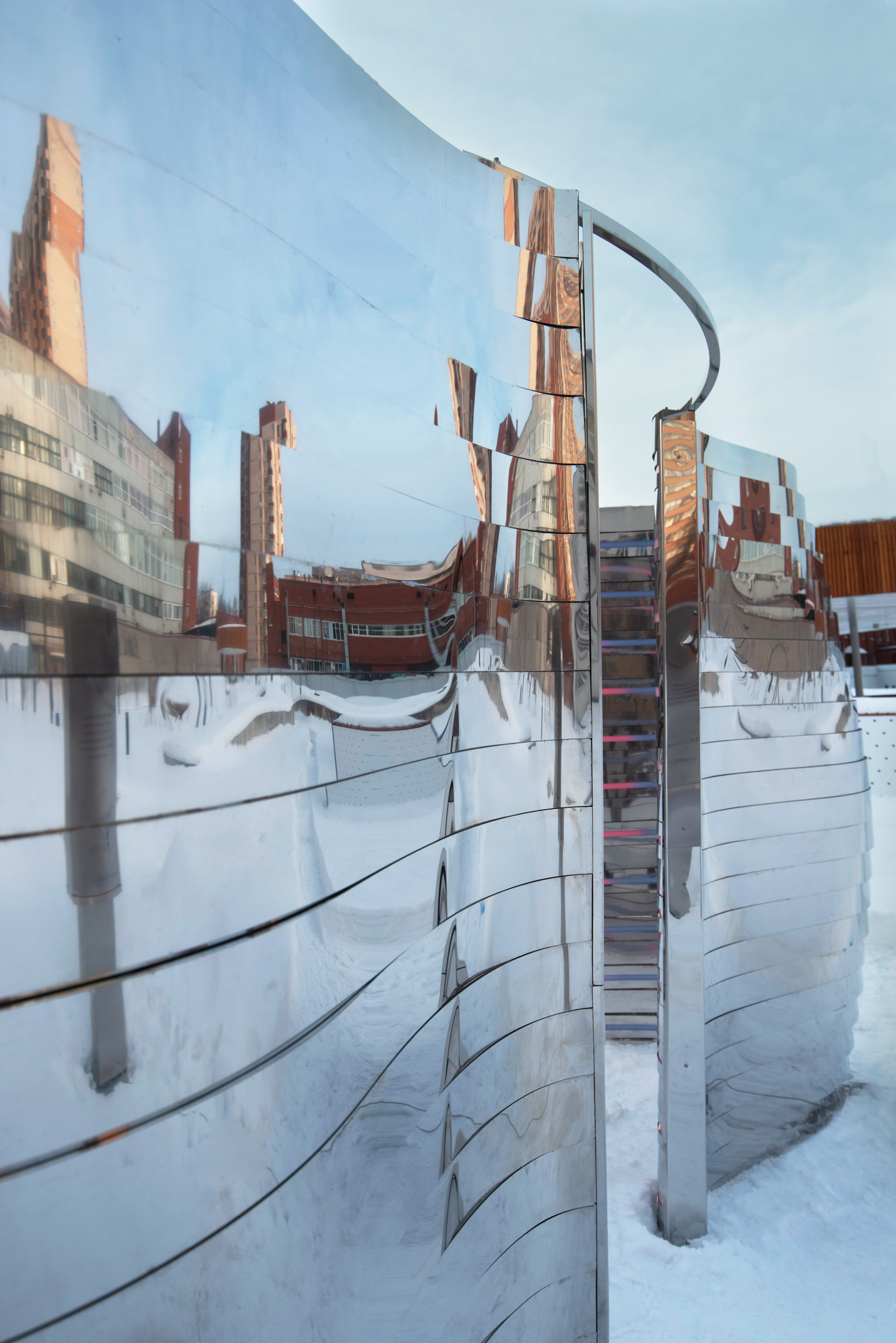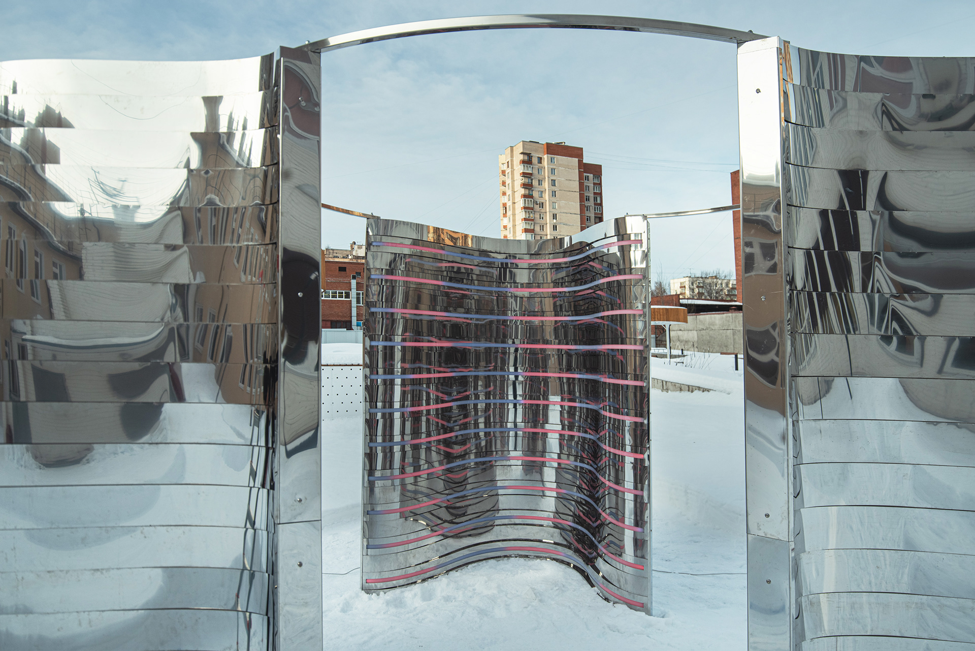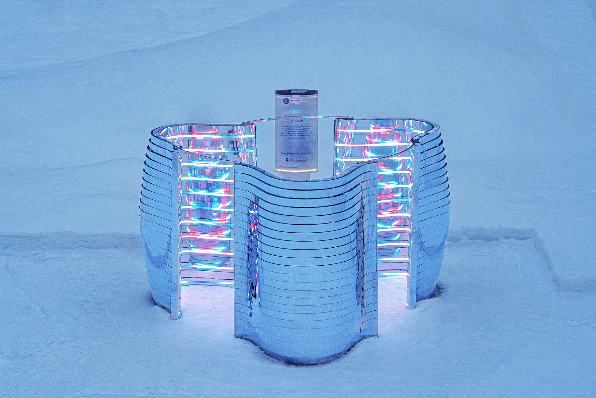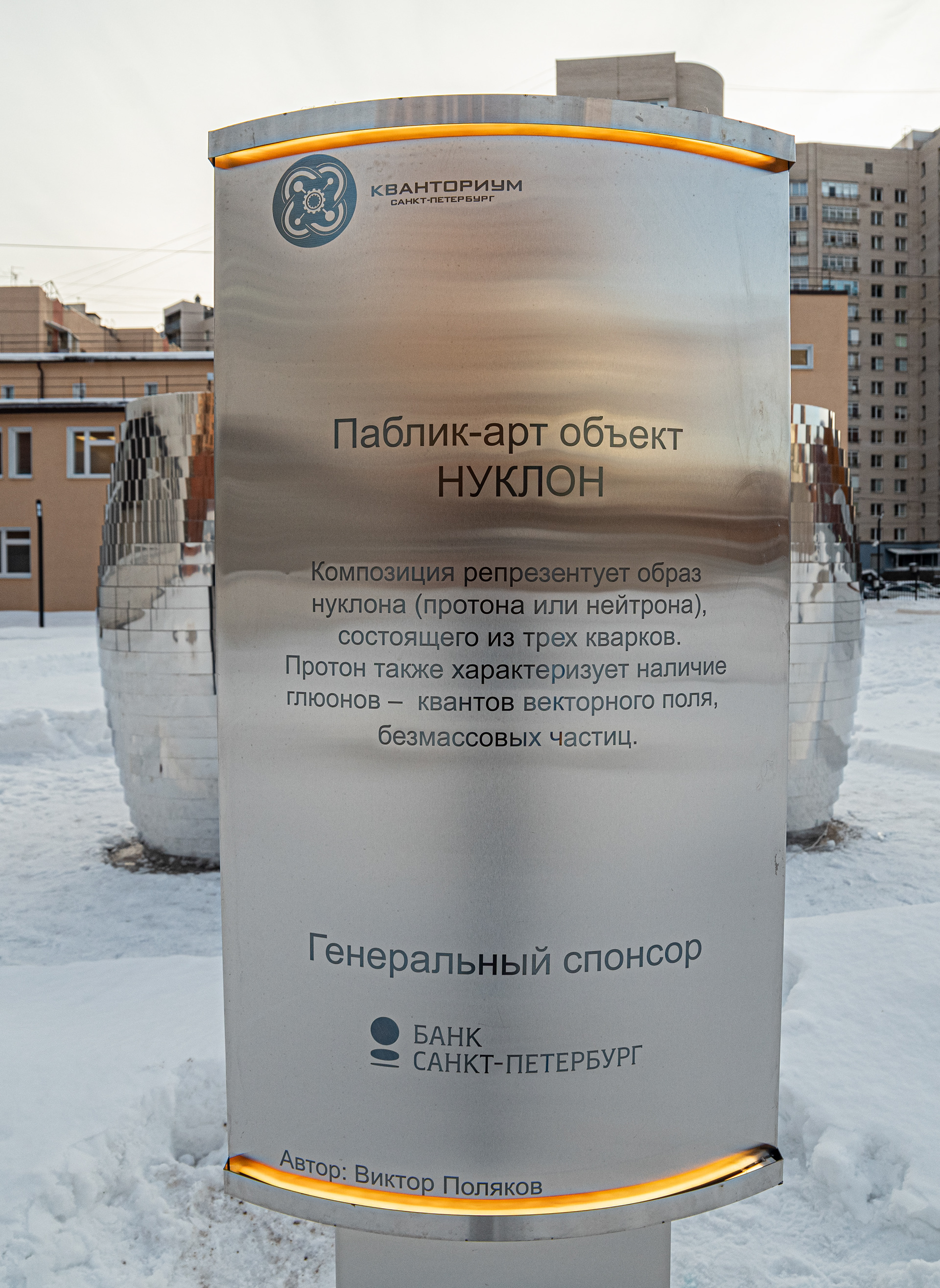Композиция отсылает к образу Нуклона, состоящему из трех кварков. Нукло́ны (от лат. nucleus «ядро») — общее название для составляющих атомного ядра — протонов и нейтронов. Три идентичных элемента отражающиеся, собранных из зеркальной нержавеющей стали отражаются друг в друге. Каждый элемент состоит из десятков зеркальных полос различной кривизны, деконструирующих окружающее пространство. Благодаря криволинейной тектонике, создается плавная, "текучая" форма инсталляции. Внутренние обводы дополнены управляемыми световыми линейками, многократно усиливающими визуальные эффекты зеркальных переотражений.