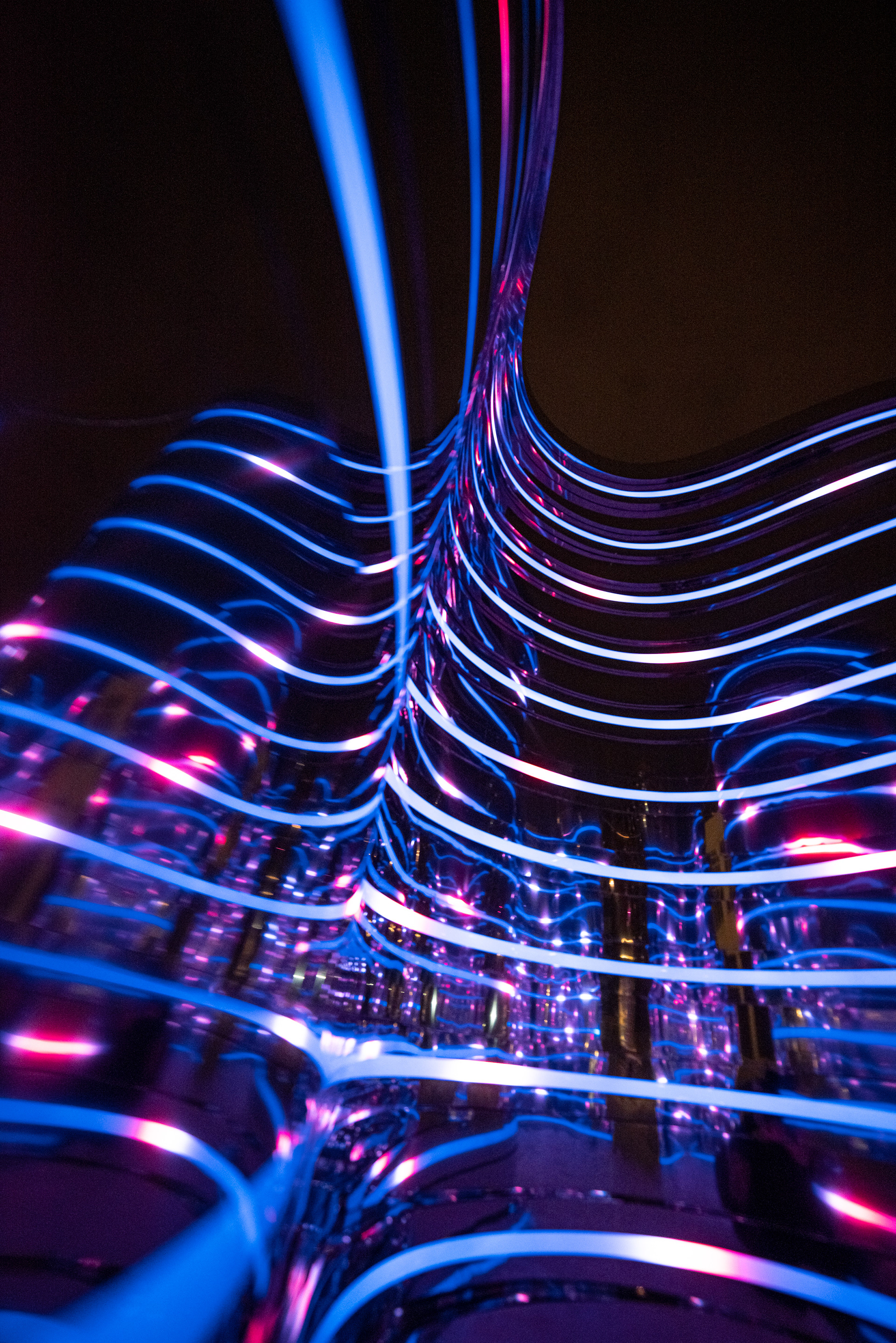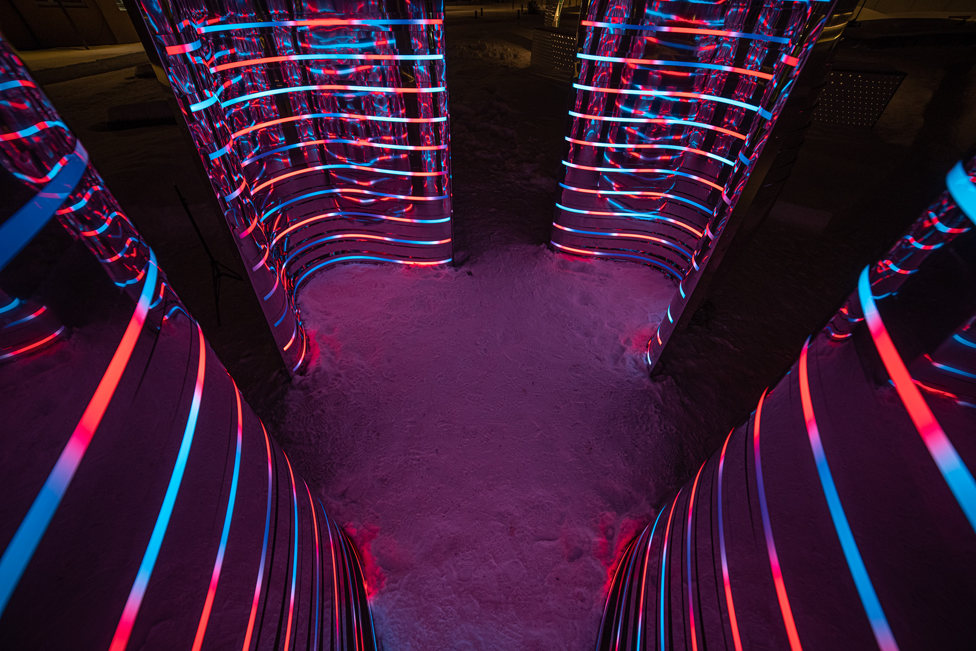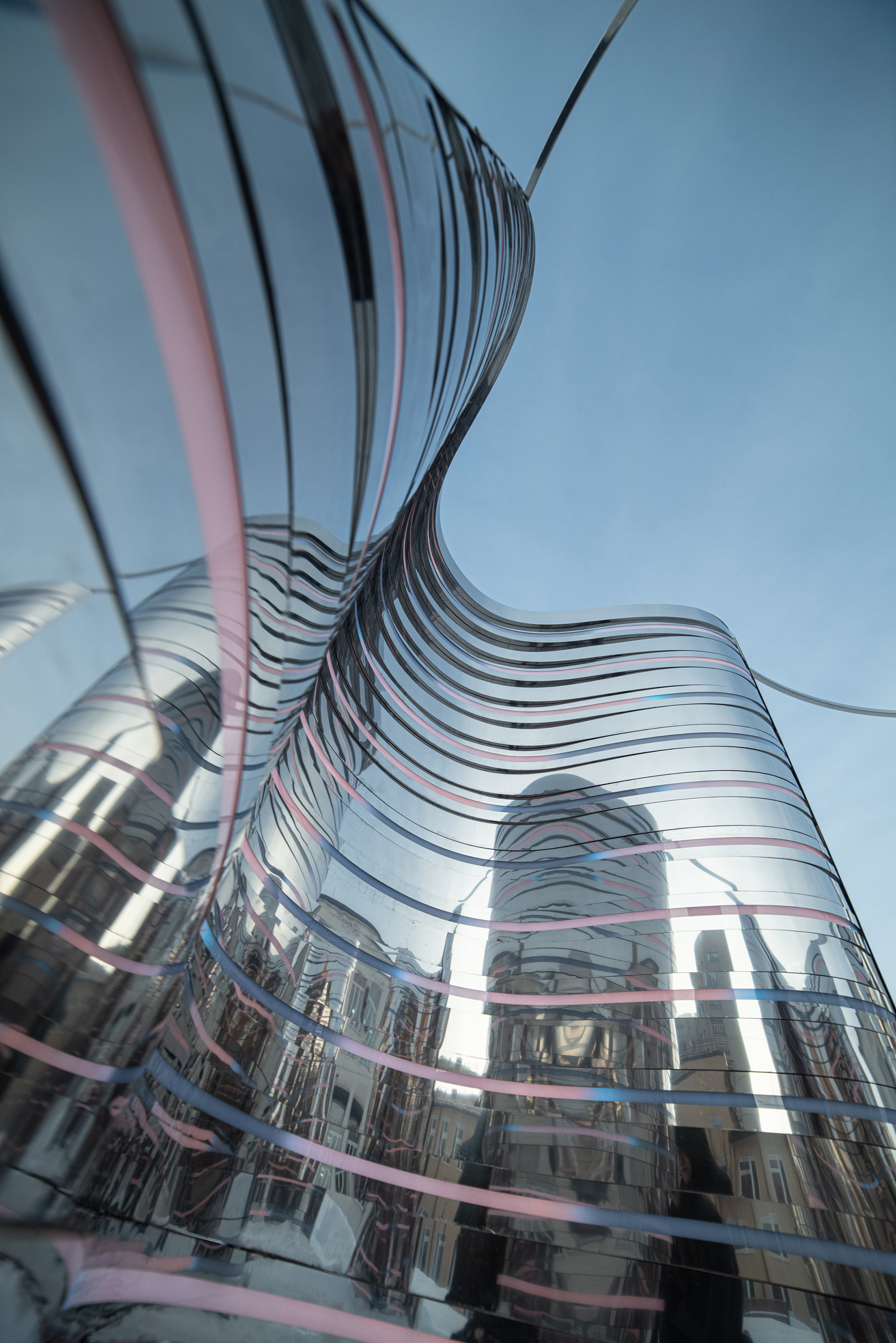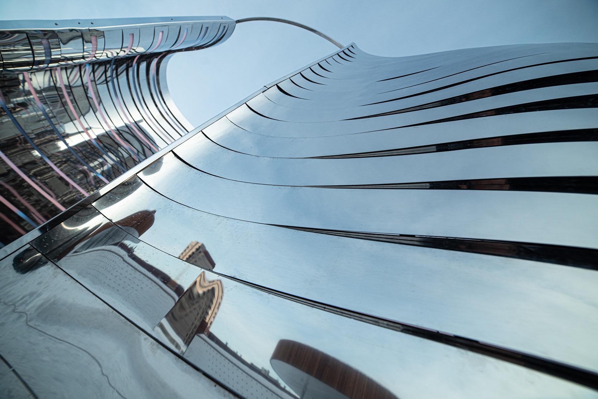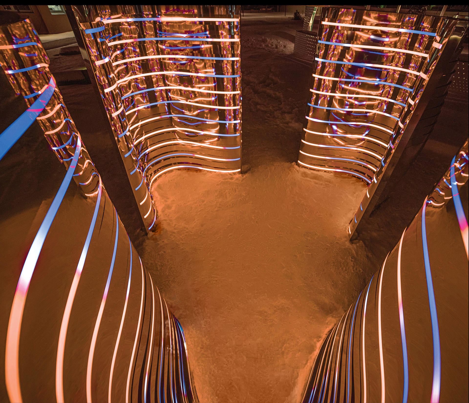 Композиция отсылает к образу Нуклона, состоящему из трех кварков. Нукло́ны (от лат. nucleus «ядро») — общее название для составляющих атомного ядра — протонов и нейтронов. Три идентичных элемента отражающиеся, собранных из зеркальной нержавеющей стали отражаются друг в друге. Каждый элемент состоит из десятков зеркальных полос различной кривизны, деконструирующих окружающее пространство. Благодаря криволинейной тектонике, создается плавная, "текучая" форма инсталляции. Внутренние обводы дополнены управляемыми световыми линейками, многократно усиливающими визуальные эффекты зеркальных переотражений.