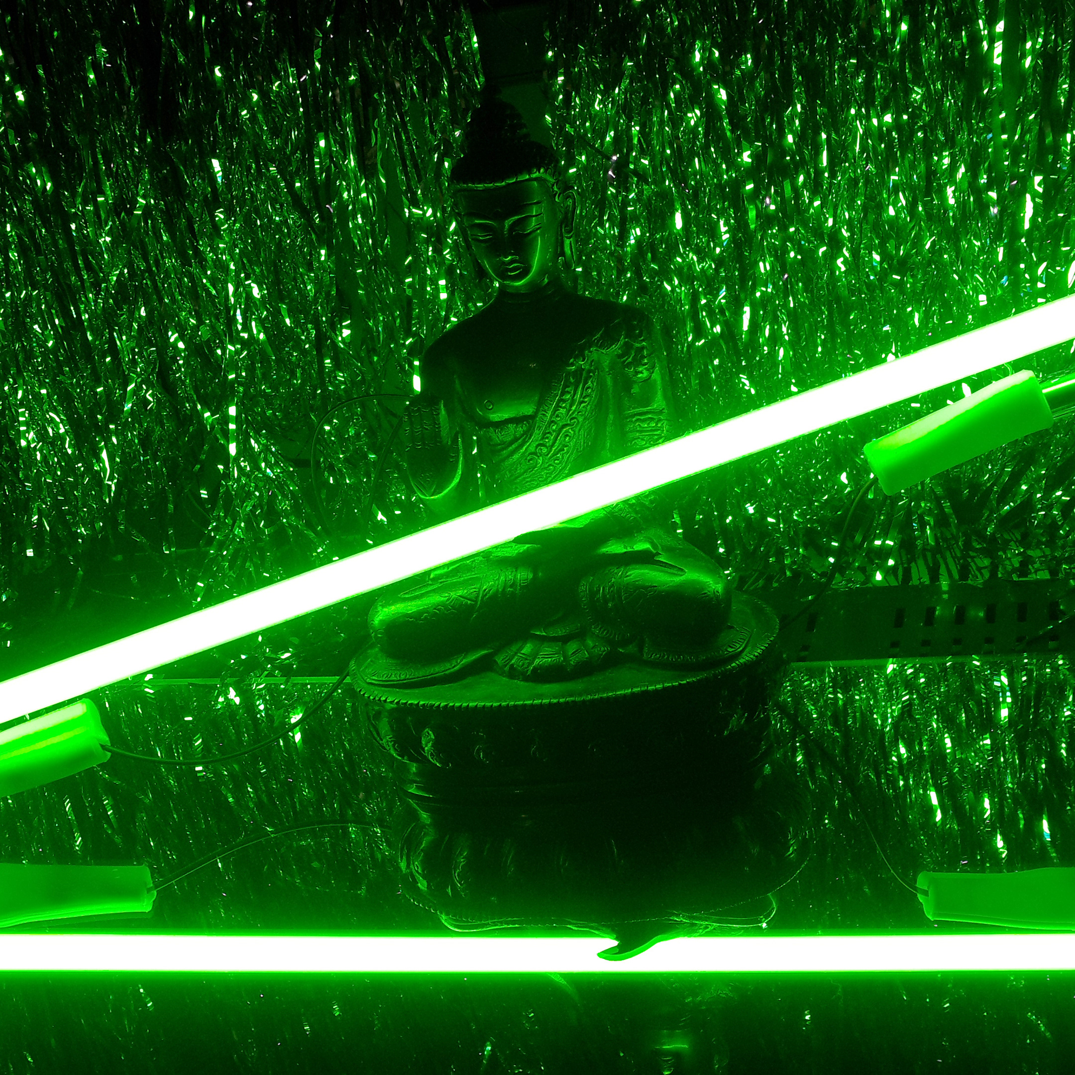 When injected into the space of the installation, the visitor finds himself in an environment saturated with dynamic reflexes. The easiest way it can be described is as a flare at the bottom of the pool on a sunny day, or reflective sunlight effects, appearing inside the arches of the coastal caves. This study uses 12 independent light sources, which leads to a complex interaction of caustic effects. Spectators traveling inside the space of work, throw multiple dynamic shadows and add means to artistic expression.