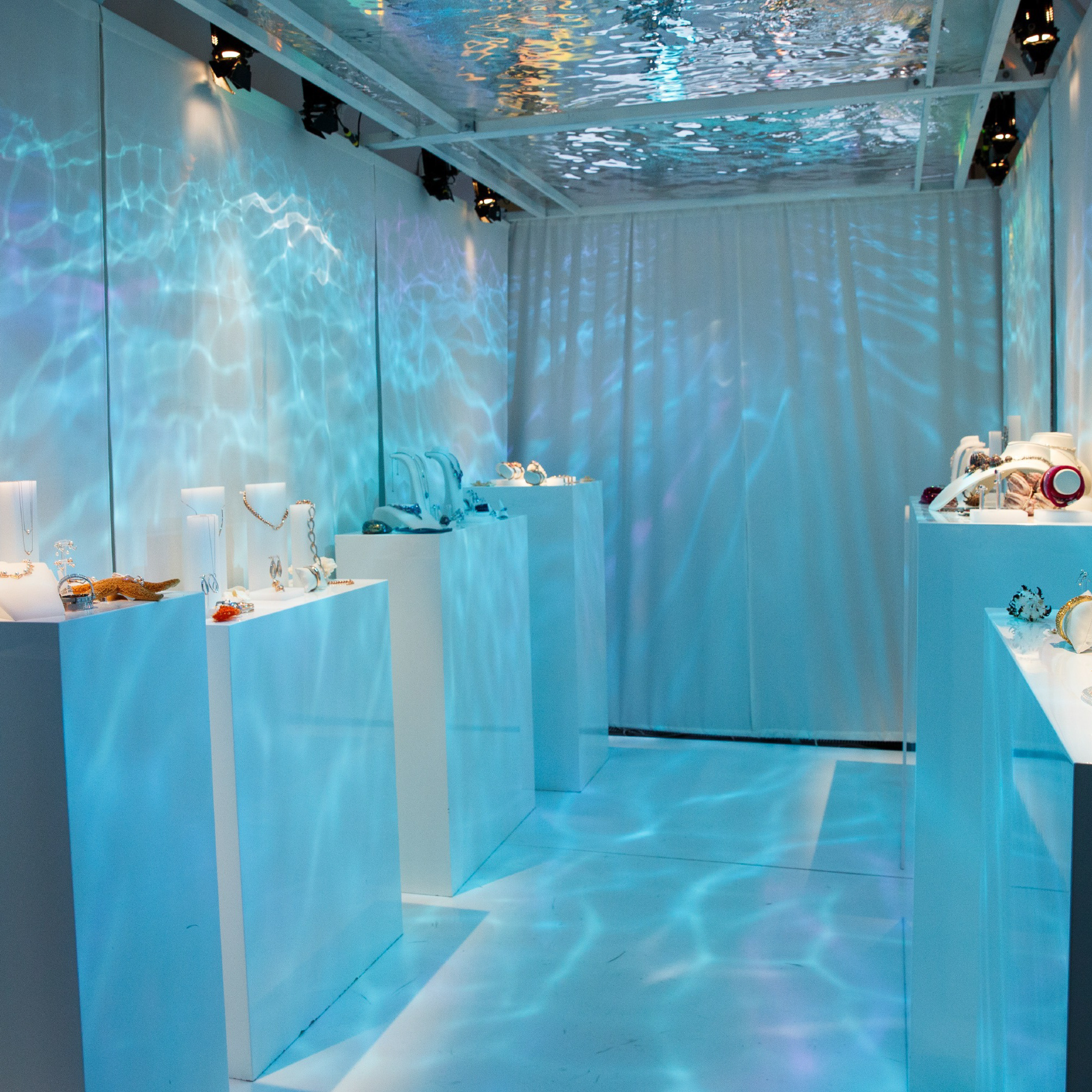 This immersive space was used to present the new collection of Swarovski jewelry "Sea of sparkle".