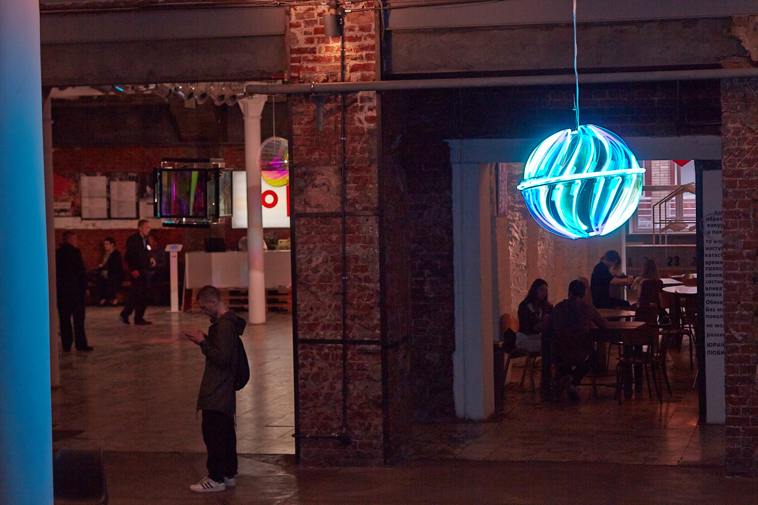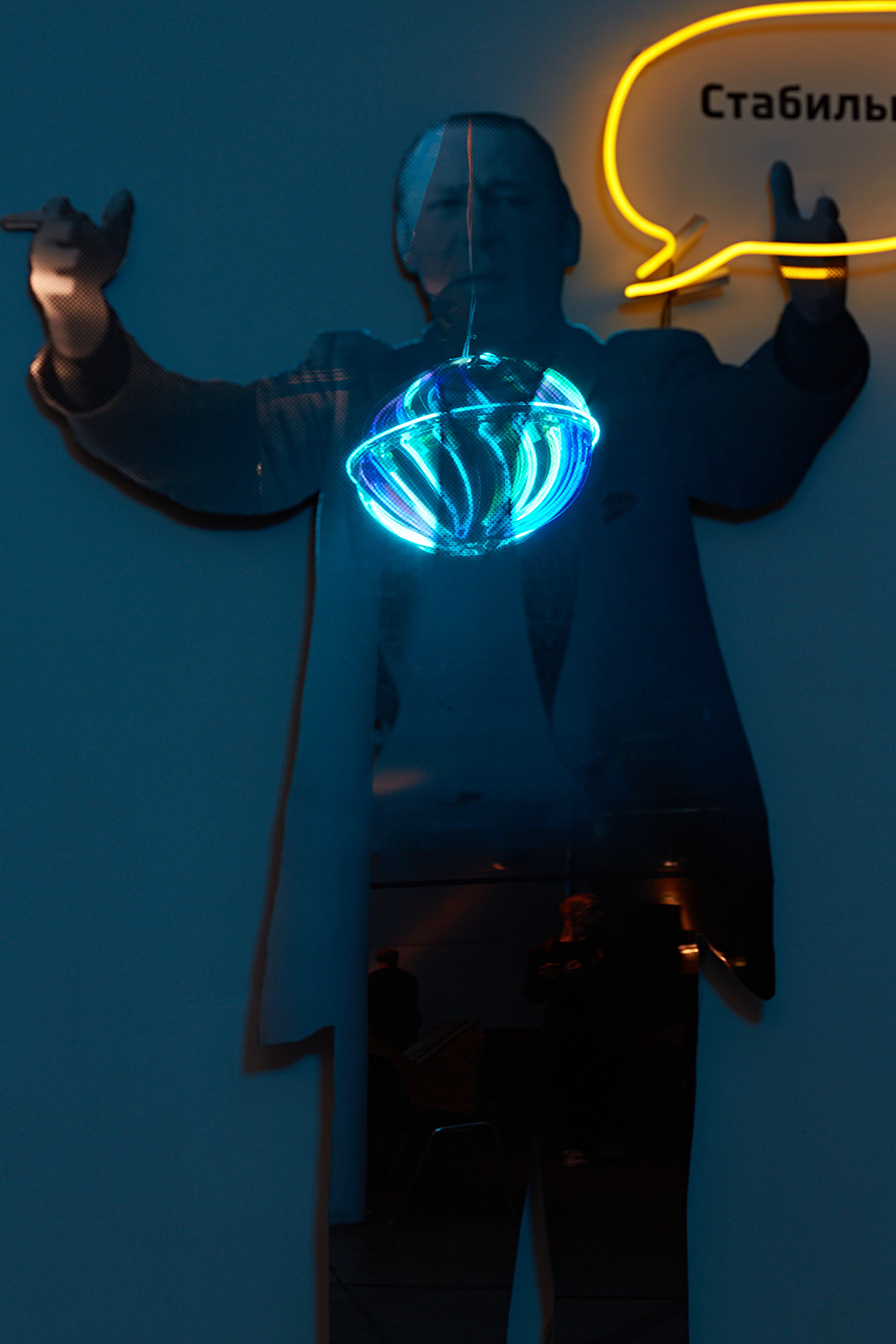 Light installation. Materials: spherical mirror, neon tubes covered by semitranslucent mirrored elements.