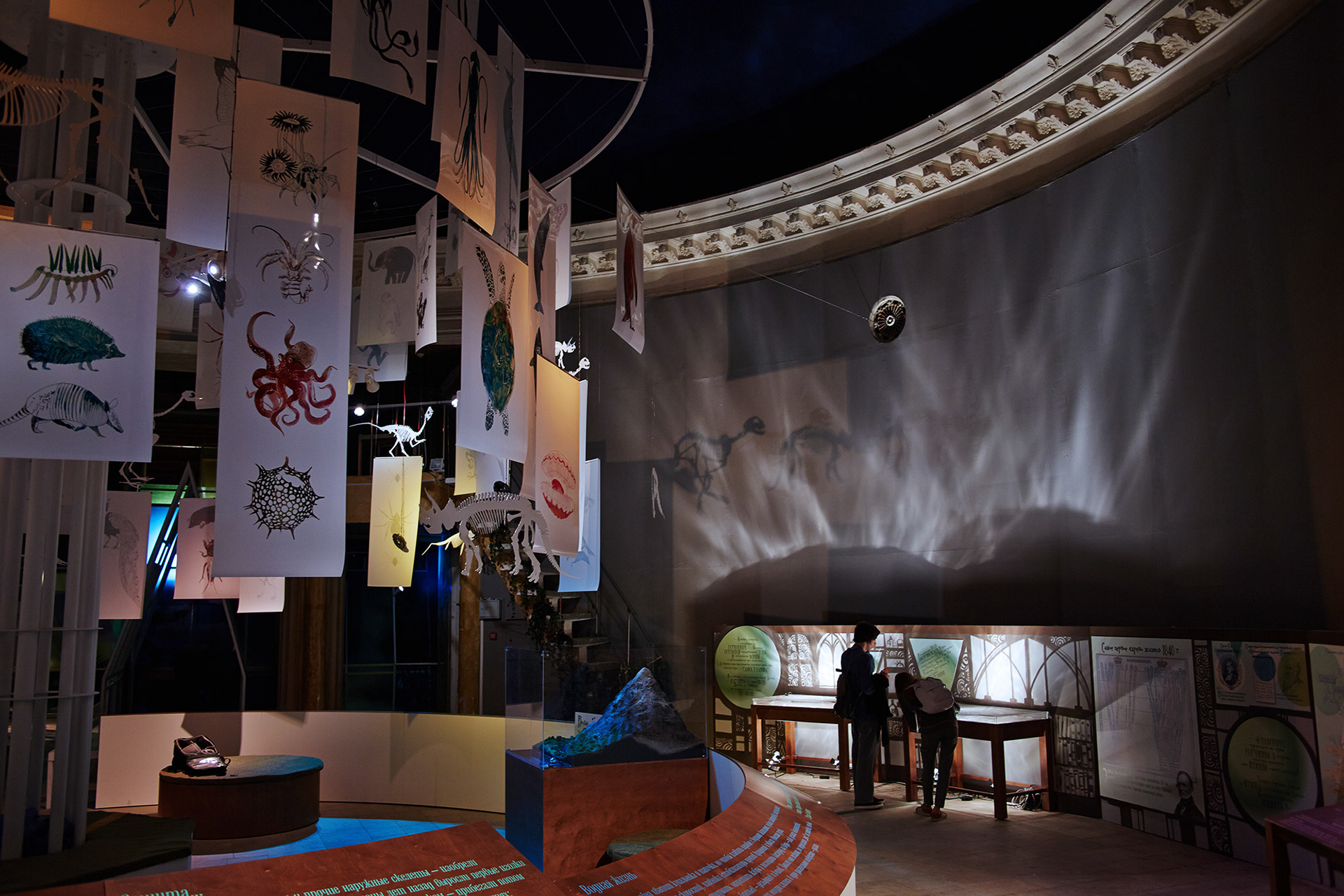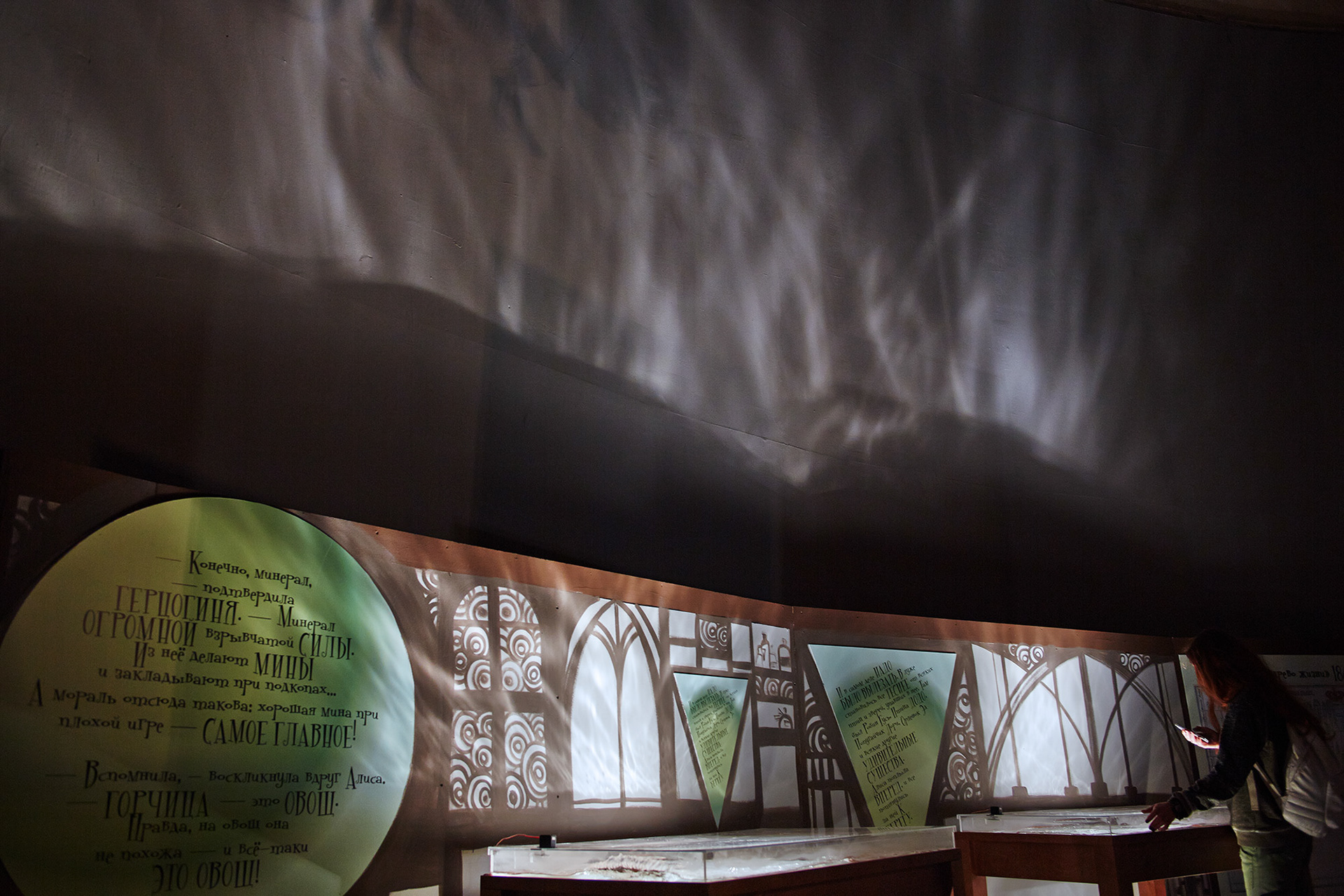 Politechnic Museum science for kids project. Conception of dynamic lighting. Specially prepared water tanks and system of motors and lighting created fluid atmospheric light installations with wave-look patterns on the wall.
